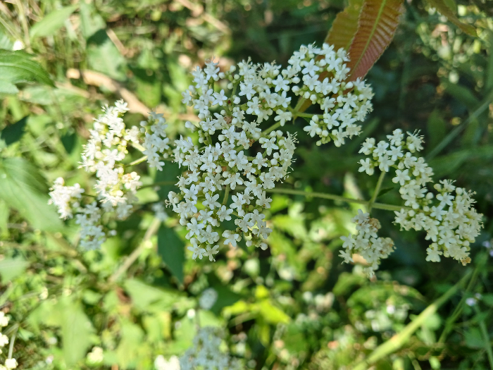 꽃은 7~8월에 백색으로 피고 가지 끝과 원줄기에 끝에 산방상으로 달리고